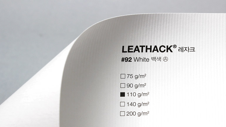 체크 모양의 잔잔한 결이 있는 종이입니다. 종이 강도가 세고 두꺼우며 색상이 선명하고 균일하게 재현됩니다. 저렴해서 레자크 재질 중에서 가장 많이 씁니다. 인쇄 표면의 백색도, 광택도, 평활도 등이 뛰어나고 잉크 전이성, 망점재현이 우수합니다. ▶용도 : 각종 봉투, 리플렛, 카달로그 표지, 명함 등